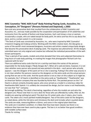 Mac Cosmetics Inc. Celebrating the ever-growing relationship between Art and Beauty. Inspired by the irreverent imaging of M.A.C Cosmetics, the creative teams of M.A.C got some of the most renowned designers, musicians, and artists to create unique body designs that became a provocative deck of playing cards. All the designs submitted were not only original and creative but reflected the individual personalities of the well-known participants. Over a period of 2 weeks, models and artists donated their time and subjected themselves to long hours of nude body painting re-creating the images that photographer Richard Lohr has captured with his lens.